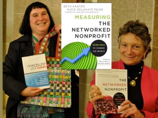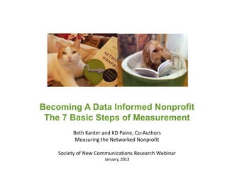 This document summarizes a presentation by Beth Kanter and KD Paine on becoming a data-informed nonprofit. It discusses the 7 basic steps of measurement for networked nonprofits and introduces a maturity model for measurement practice with four stages: crawl, walk, run, fly. Key advice includes starting simply by discussing desired results and identifying relevant metrics, experimenting to evolve measurement over time, and using data to learn and improve. The presenters emphasize how measurement can help nonprofits better understand their impact and become more effective.
