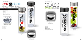 This document provides information on and images of various water bottles, tumblers, and other drinkware items. It showcases double wall bottles and tumblers made of glass, plastic, and other materials. Single wall bottles, sport bottles, and bottles made of Tritan are also highlighted. Various colors, sizes, and other features are displayed, along with pricing and packaging details. The document appears to be presenting a catalog of drinkware options for promotional products.