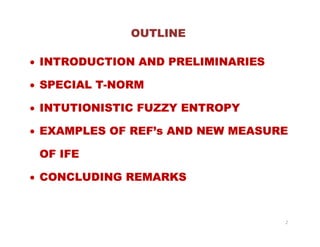 This document discusses studies on measures of intuitionistic fuzzy information. It begins with introductions and definitions related to fuzzy sets, intuitionistic fuzzy sets, and measures of fuzzy entropy. It then discusses special t-norm operators and proposes a measure of intuitionistic fuzzy entropy based on these t-norms. The measure is defined using a function of the membership, non-membership, and hesitancy degrees of an intuitionistic fuzzy set. Several desirable properties of such a measure are outlined, including sharpness, maximality, resolution, symmetry, and valuation. The document provides mathematical foundations and definitions to propose and analyze a measure of intuitionistic fuzzy entropy.