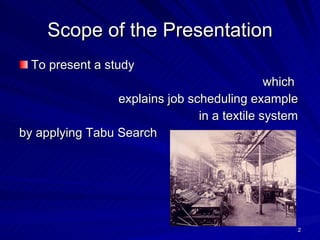 1) The document presents a study applying Tabu Search to schedule jobs in a textile manufacturing system in order to minimize maximum lateness on a single machine.