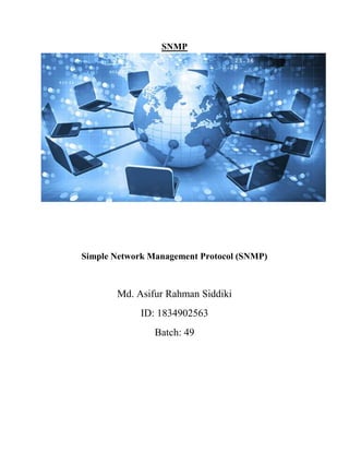 Simple Network Management Protocol (SNMP) is an application layer protocol used to exchange management information between network devices. SNMP allows a network management system to monitor and control different types of devices on a network such as routers, switches, printers and more. Each network device contains an SNMP agent which collects data from the device and stores it in a Management Information Base (MIB). The SNMP manager can then query the agents to retrieve specific information from their MIBs to monitor network performance and detect issues.