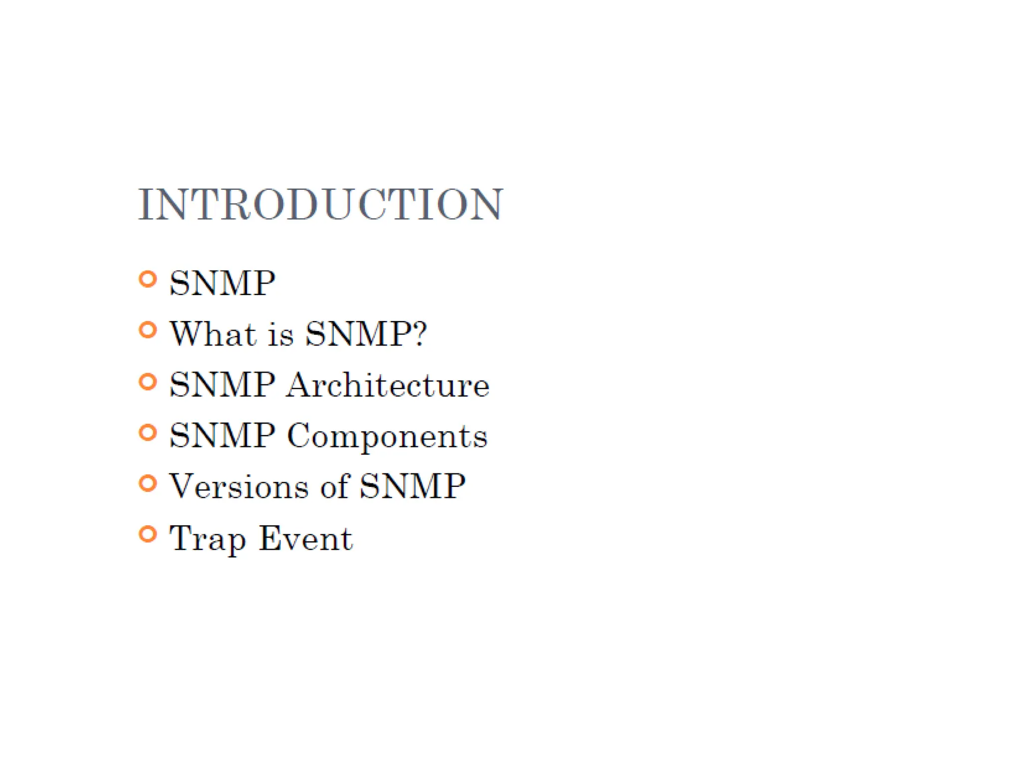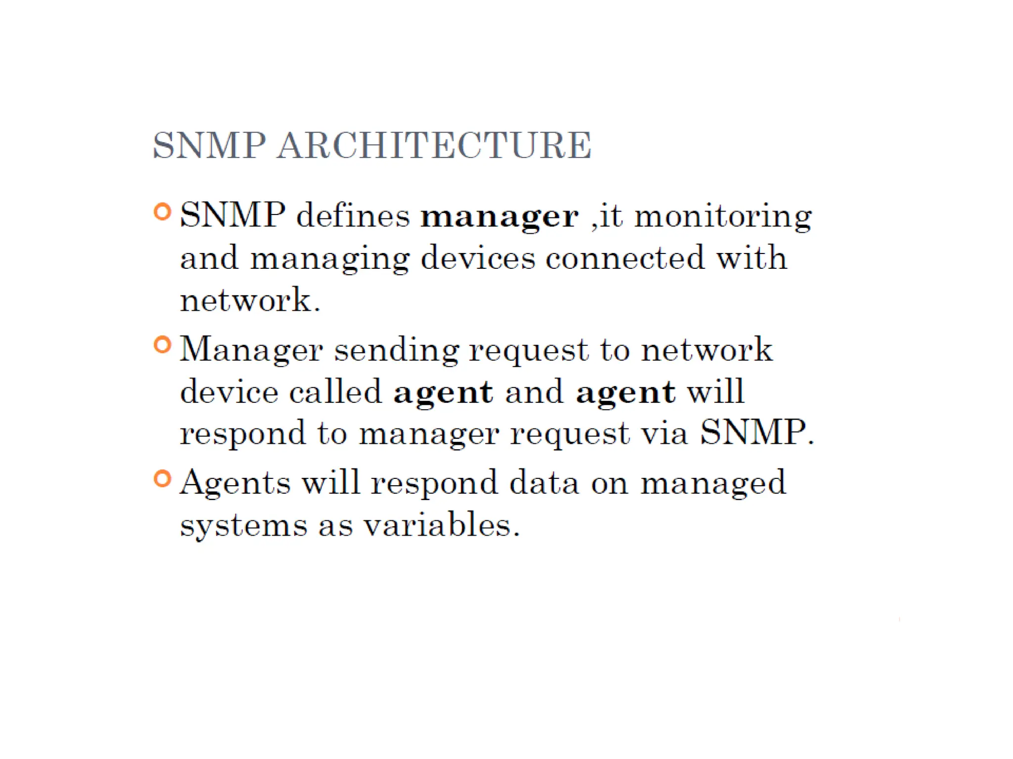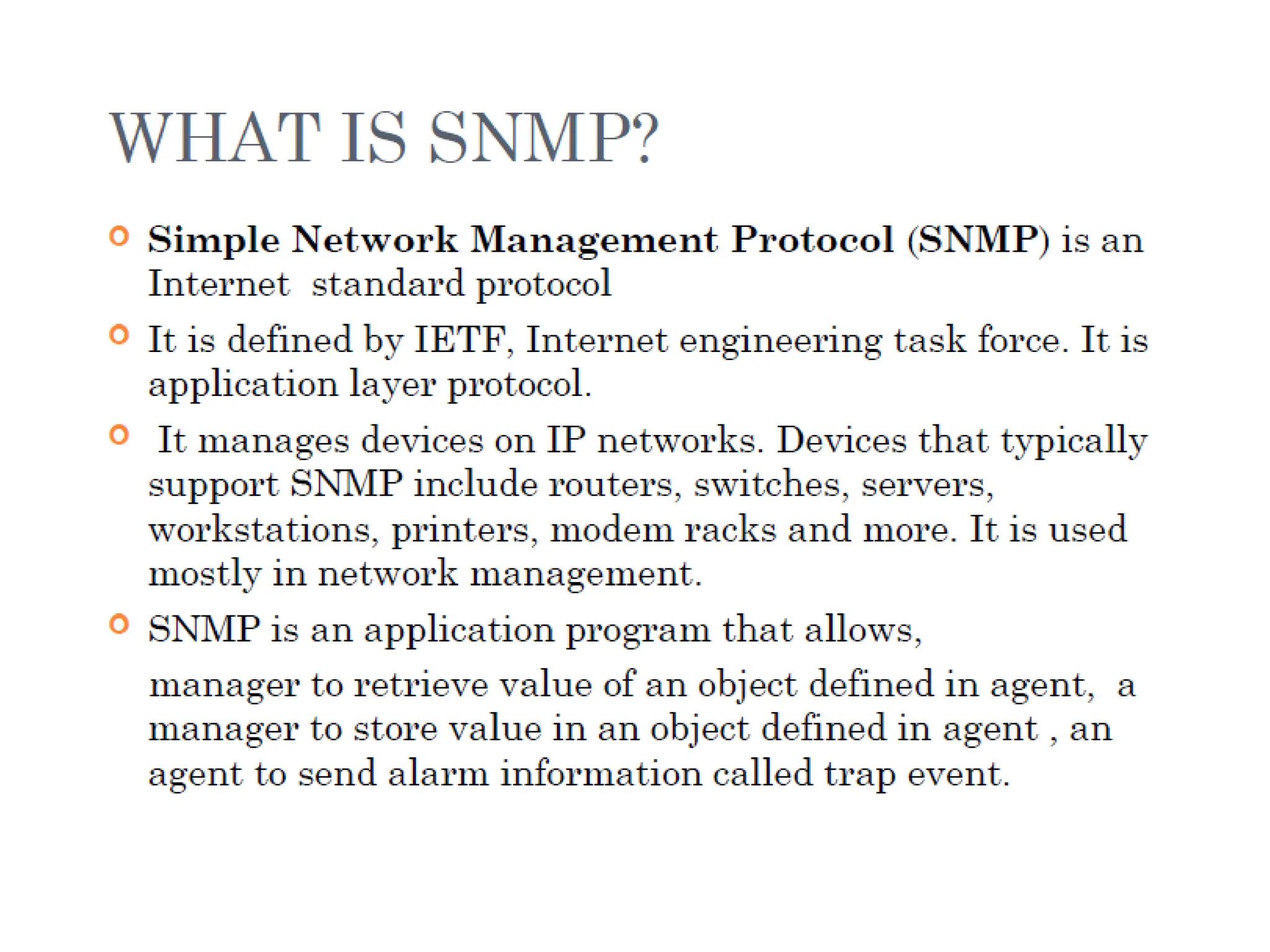 SNMP uses a manager-agent model where a manager host monitors and controls a set of agent routers and servers. Common tools for network monitoring using SNMP include Wireshark, Microsoft Network Monitor, Opmanager, Capsa Free, and NAST. These tools allow monitoring of SNMP enabled devices on a network.