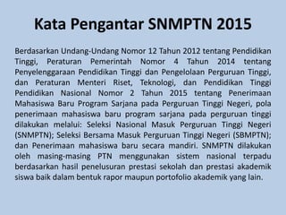 Dokumen ini membahas pelaksanaan Seleksi Nasional Masuk Perguruan Tinggi Negeri (SNMPTN) tahun 2015, termasuk ketentuan, tata cara pendaftaran, dan syarat bagi peserta. SNMPTN bertujuan memberikan kesempatan kepada siswa berprestasi untuk meneruskan pendidikan tinggi tanpa biaya pendaftaran, dan hasil seleksi berdasarkan prestasi akademik yang tercatat di Pangkalan Data Sekolah dan Siswa (PDSS). Informasi lebih lanjut mengenai tata cara dan jadwal dapat diakses di laman resmi SNMPTN.