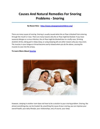There are many potential causes of snoring including blocked airways due to allergies, infections, alcohol consumption, sleeping pills, obesity, enlarged tonsils or adenoids, and relaxed throat muscles. Snoring can negatively impact health by increasing risks of sleep apnea and disorders like insomnia. It also negatively impacts relationships by disrupting the sleep of partners and reducing intimacy. Natural supplements like throat sprays can provide relief by lubricating the throat and reducing airway blockages.