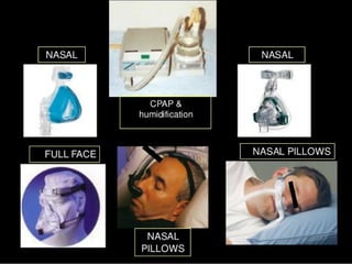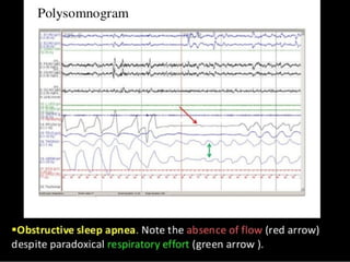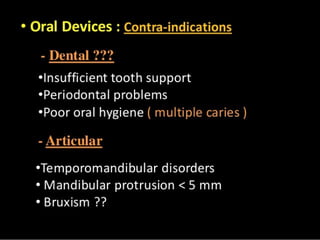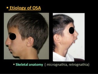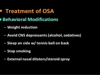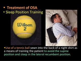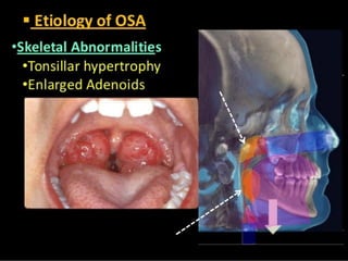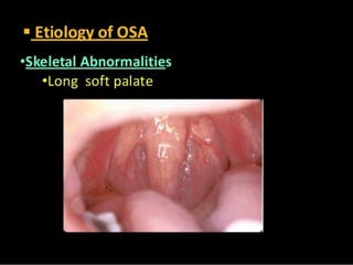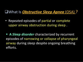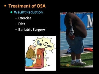 The document discusses obstructive sleep apnea and its association with snoring, which is a noise caused by vibrating throat tissues during sleep due to airway obstruction. Contributing factors include anatomy, alcohol, obesity, and other health issues, with effects such as daytime sleepiness and poor concentration. Diagnosis involves medical history and physical examination, and treatment options range from lifestyle changes to CPAP machines and surgical interventions.
