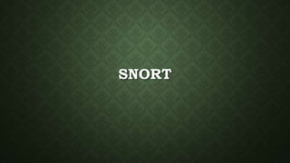 This document provides an overview of Snort, an open source intrusion detection system (IDS). It discusses what an IDS is and how Snort works by examining packets and applying rules with a specific syntax. Key points covered include common IDS functionality, Snort rule structure and options, how content detection works, and using Snort to replay packet captures and test rulesets.