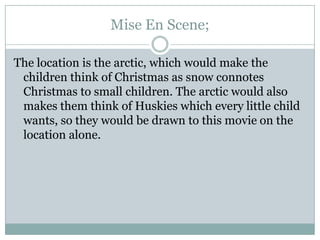 This document summarizes elements of mise-en-scene, camerawork, sound, and editing in the movie trailer for "Snow Dog's". It notes that the arctic location conveys themes of Christmas and huskies. Camera angles show the humans are in charge but low angles depict the dogs' power running together. Close-ups add humor by showing a mischievous dog's eyebrows. The Disney soundtrack entices audiences, and voiceovers characterize the dogs during their introductions. Text overlays use wipes and straight cuts realistically transition between scenes.