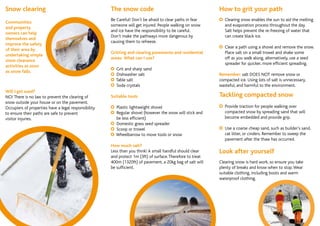 3. Clear snow in the morning before compaction, do not use water, and deposit snow in gardens not drains, offering to help clear neighbors' paths as well.