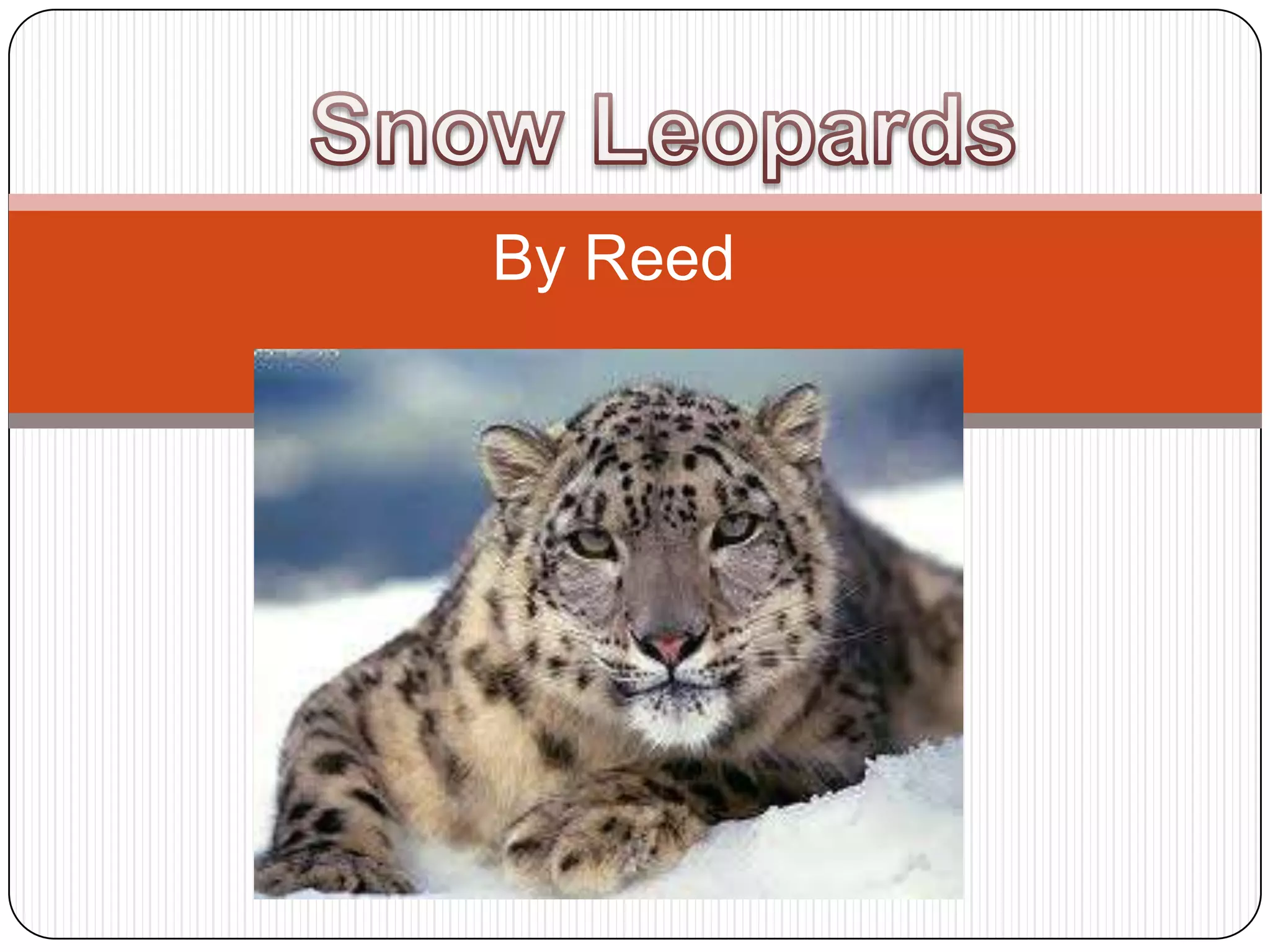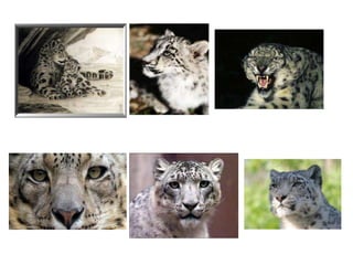 Snow leopards are a solitary cat species found in Central and South Asia. They have long grey fur with black spots that helps them camouflage in their mountainous habitat. Snow leopards primarily prey on wild goats, sheep, and deer. They are classified as an endangered species due to habitat loss and poaching for their fur. Zoos aim to simulate their natural habitat with logs, dens, and vegetation to maintain their solitary behaviors.