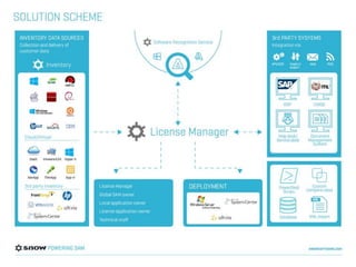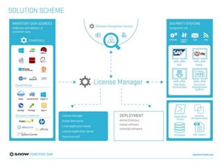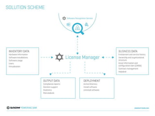 The document discusses Snow License Manager and software asset management. It provides an overview of Snow products and services, who should manage software compliance, what information is needed for management, and the day-to-day tasks involved. Key aspects of management include adopting tools, maintaining entitlements, agreements and renewals, usage monitoring, and being aware of current and future risks like cloud, virtualization, and new license metrics.
