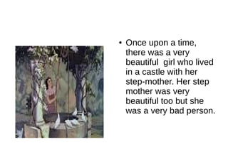 Snow White lived with her evil stepmother, who was jealous of Snow White's beauty. When Snow White is deemed the fairest, the stepmother tries to have her killed. Snow White escapes into the forest and finds shelter in the dwarfs' cottage. She does chores for the dwarfs but grows tired and leaves for the castle, where she is accused of killing her stepmother and imprisoned.