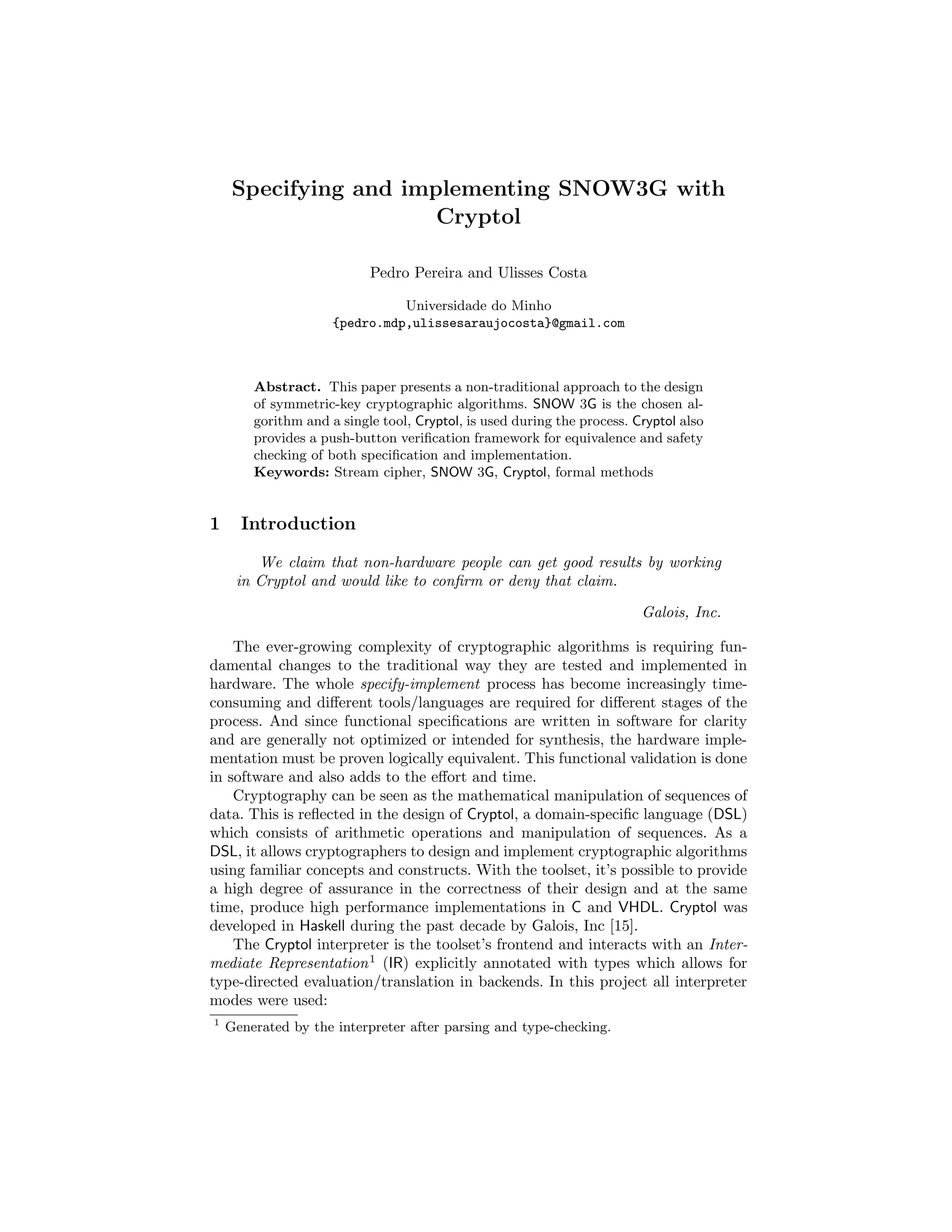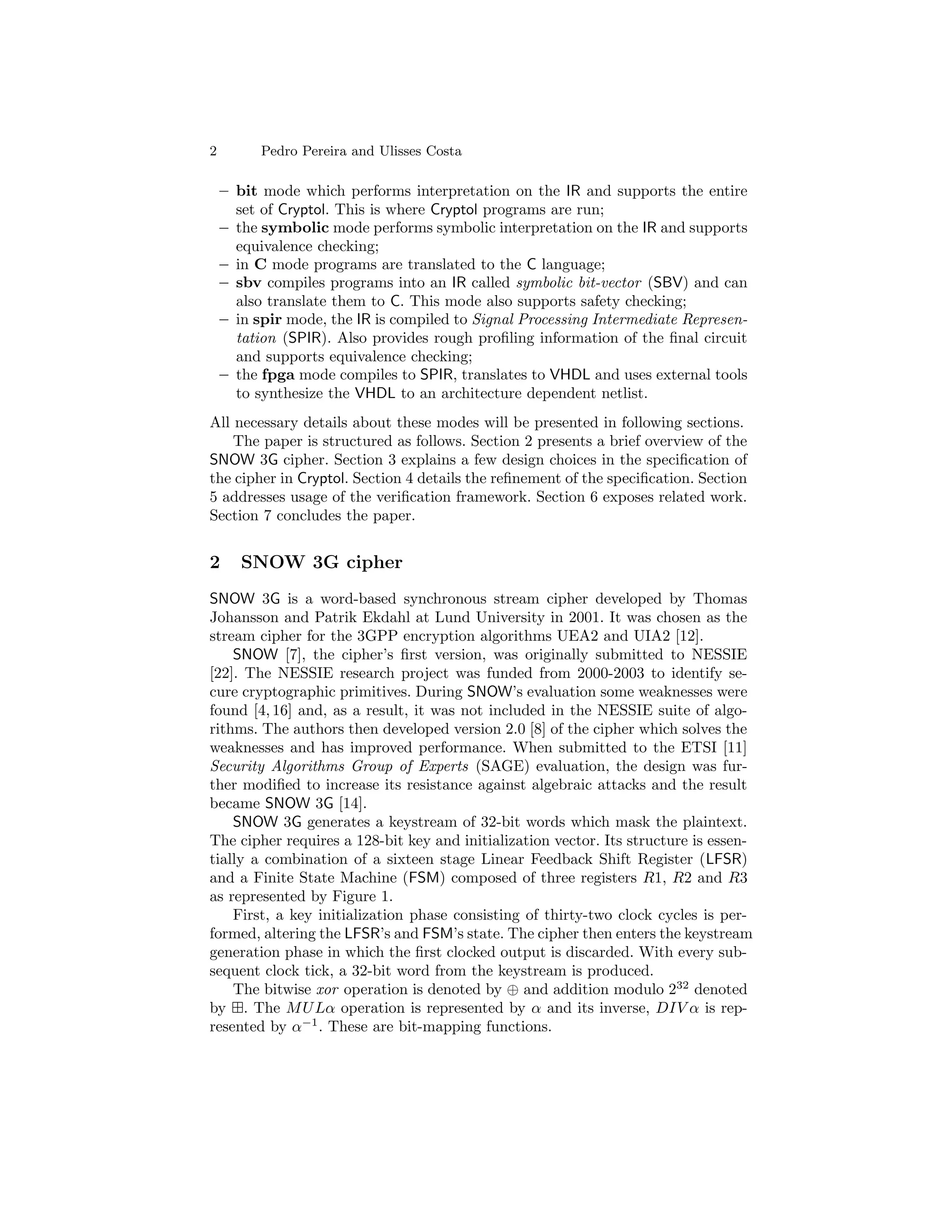 This document discusses specifying and implementing the SNOW3G stream cipher using the Cryptol domain-specific language. Cryptol allows the algorithm to be specified concisely using its mathematical constructs. The specification must then be refined to meet hardware implementation restrictions in Cryptol. Optimization techniques like converting functions to lookup tables are explored to improve the efficiency of the generated hardware implementation. Preliminary timing and size estimates of the implementation in SPIR format are provided.