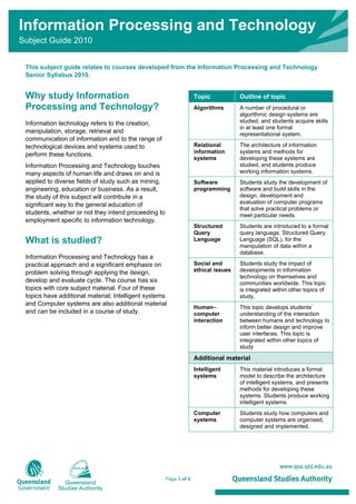 This document provides an overview of the Information Processing and Technology subject guide for 2010. It outlines the key topics covered in the subject including algorithms, relational information systems, software programming, structured query language, social and ethical issues, and human-computer interaction. Students will learn through a variety of hands-on activities like using technology, problem solving, and developing computer programs. Assessment involves supervised written tests, extended response assignments, and project-based assessments where students apply their skills and knowledge. The guide also provides advice for parents on how to support their child's learning in this subject.