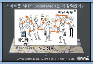 스마트폰 시대의 SocialMedia는 왜 강력한가? 확산속도신뢰개인화 기기-휴대성, 즉시성, 연결성위치정보+시맨틱, 대용량 데이터 실시간 처리, 인공지능, 소셜서치