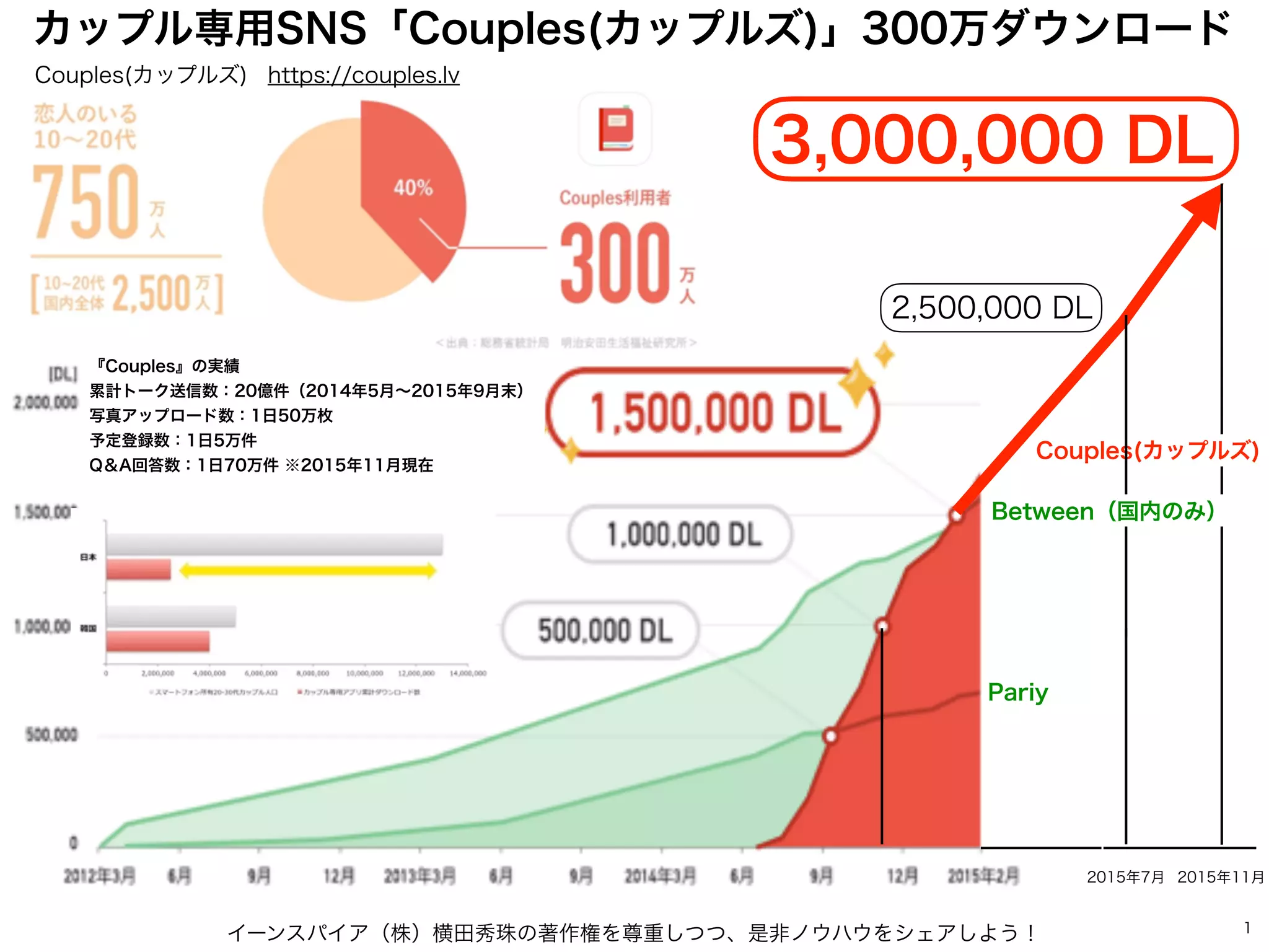 カップル専用SNS「Couples(カップルズ)」300万ダウンロード イーンスパイア(株)横田秀珠の著作権を尊重しつつ、是非ノウハウをシェアしよう! 1 2015年7月 2015年11月 2,500,000