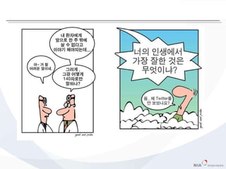 1. 운영지침마련 필요 ( 규제하기 위함이 아니고 부작용을 막고 긍정적 활요 위함 ) 2. 자율권 부여 및 전담관리인력 필요 ( 운영팀내 SNS 파워유저 배치 , 지원팀구성 등 ) 3. 콘트롤 가능한 범위내의 숫자로 채널을 시작하고 , 점차 세분화 4. 경영층은 물론 내부직원들의 인식을 개선할 수 있는 노력 필요 - 정량적 가치 ( 트위터의 경우 팔로워 수 ) 를 높여라 - SNS 관련 이슈를 선점하라 - 신뢰를 확보하라 방송등 기존 매체에 자주 노출 될 수 있게 하라 공공부문 소셜 네트웍 서비스 (SNS) 도입 전략 SNS 를 이해하고 많이 듣고 소통하고