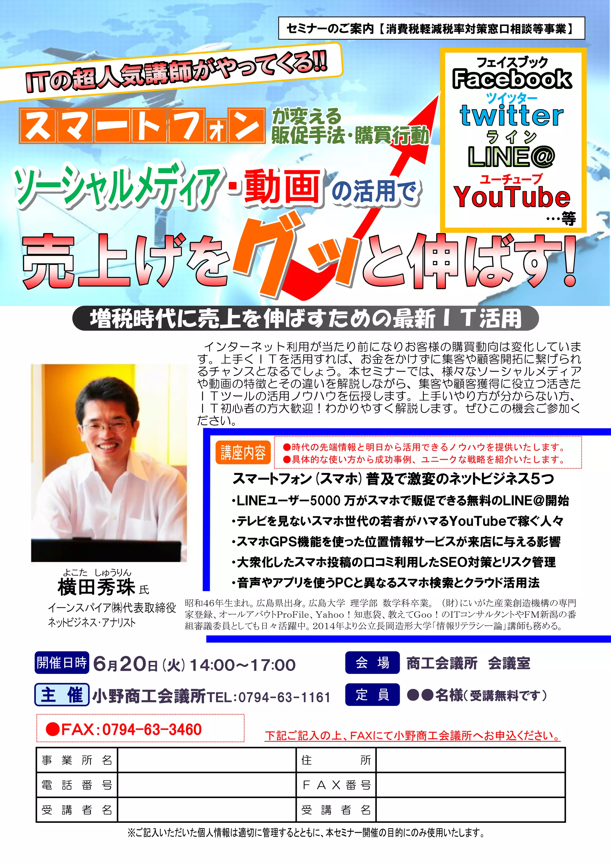 名 住 所 電 話 番 号 F A X 番 号 受 講 者 名 受 講 者 名 インターネット利用が当たり前になりお客様の購買動向は変化していま す。上手くITを活用すれば、お金をかけずに集客や顧客開拓に繋げられ るチャンスとなるでしょう。本セミナーでは、様々なソーシャルメディア や動画の特徴とその違いを解説しながら、集客や顧客獲得に役立つ活きた ITツールの活用ノウハウを伝授します。上手いやり方が分からない方、 IT初心者の方大歓迎!わかりやすく解説します。ぜひこの機会ご参加く ださい。 セミナーのご案内 【消費税軽減税率対策窓口相談等事業】 昭和46年生まれ。広島県出身。広島大学 理学部 数学科卒業。 (財)にいがた産業創造機構の専門 家登録、オールアバウトProFile、Yahoo!知恵袋、教えてGoo!のITコンサルタントやFM新潟の番 組審議委員としても日々活躍中。2014年より公立長岡造形大学「情報リテラシー論」講師も務める。 スマートフォン(スマホ)普及で激変のネットビジネス5つ ・LINEユーザー5000 万がスマホで販促できる無料のLINE@開始 ・テレビを見ないスマホ世代の若者がハマるYouTubeで稼ぐ人々 ・スマホGPS機能を使った位置情報サービスが来店に与える影響 ・大衆化したスマホ投稿の口コミ利用したSEO対策とリスク管理 ・音声やアプリを使うPCと異なるスマホ検索とクラウド活用法 ●時代の先端情報と明日から活用できるノウハウを提供いたします。 ●具体的な使い方から成功事例、ユニークな戦略を紹介いたします。 下記ご記入の上、FAXにて小野商工会議所へお申込ください。 6月20日(火)14:00~17:00 商工会議所 会議室 ●●名様(受講無料です)小野商工会議所TEL:0794-63-1161 ●FAX:0794-63-3460