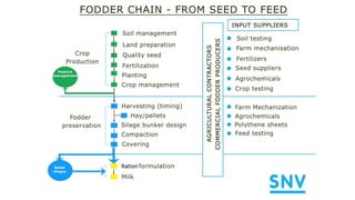 The SNV Kenya Market-Led Dairy Programme (KMDP) focuses on enhancing fodder production and preservation to increase dairy productivity and profitability for farmers. The program implements various interventions, including improved fodder management practices, agricultural contracting services, and youth-led service provider enterprises. Key recommendations emphasize the need for quality fodder supply, mechanization in production, and better alignment of research with local farming needs to boost the dairy sector's sustainability and efficiency.