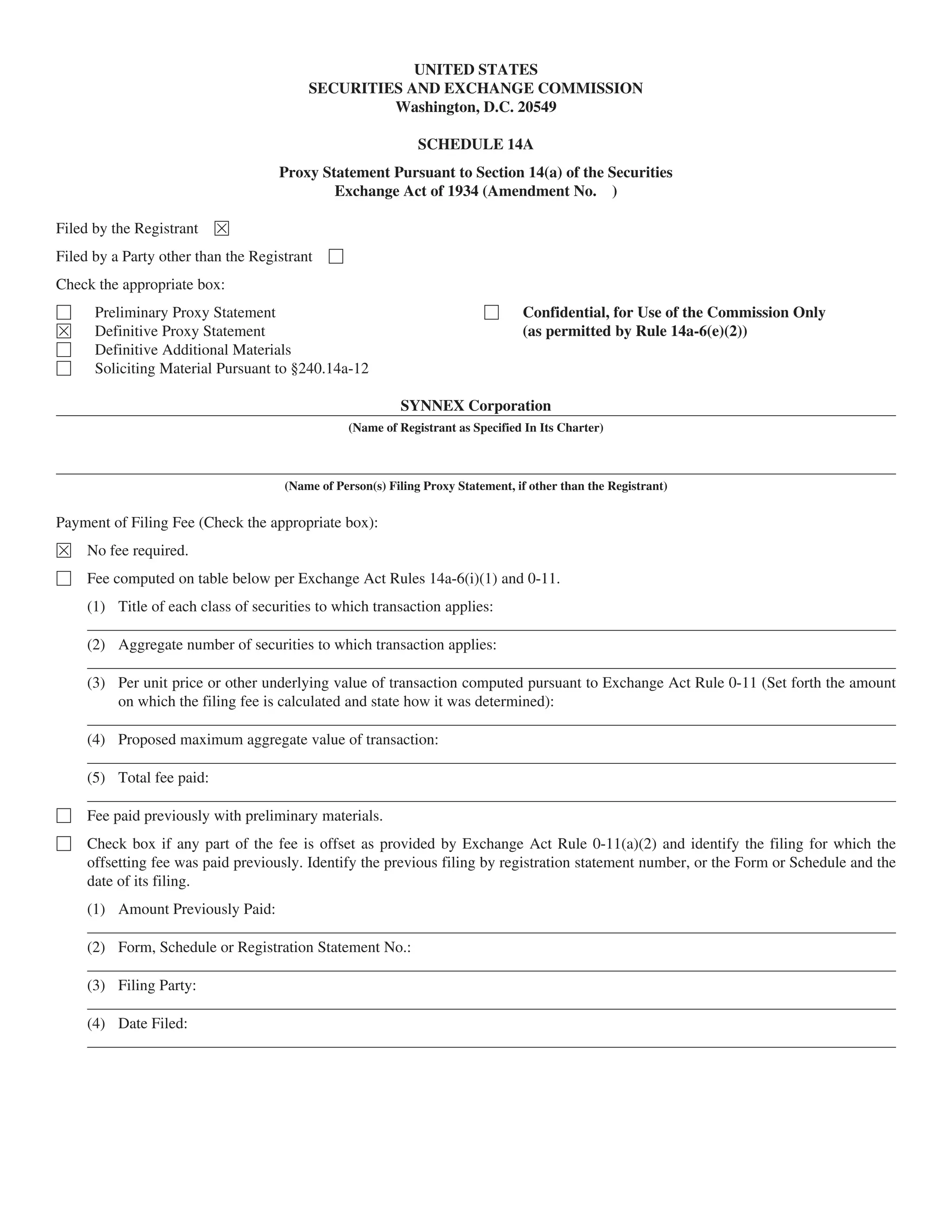 This document is a proxy statement from SYNNEX Corporation notifying shareholders of a Special Meeting of Shareholders to be held on August 19, 2008. The sole purpose of the meeting is to approve the material terms of the company's 2003 Stock Incentive Plan in order to preserve the ability to receive tax deductions that may otherwise be disallowed under Internal Revenue Code Section 162(m). Shareholders of record as of July 3, 2008 are entitled to vote. The proxy statement provides information on voting procedures and recommendations by the Board of Directors.