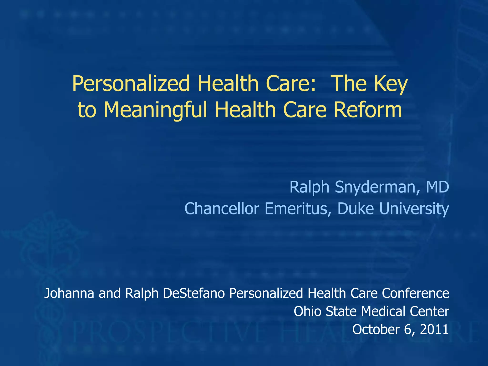 The document discusses the need for personalized health care as the key to meaningful health care reform. It outlines how medicine has progressed from focusing on single factors to understanding disease as complex with multiple interacting factors. Personalized health care involves using tools like genomics, biomarkers and clinical risk models to quantify individual health risks, monitor disease progression, select targeted therapies, and create personalized health plans and treatment timelines. The document provides an example of how this approach could be used to create a personalized cancer care plan.