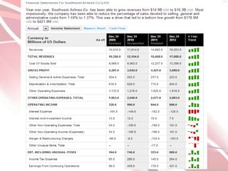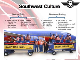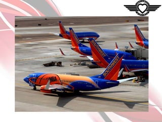 Southwest Airlines has grown since 1967 to become one of the largest low-cost carriers in the world through a strategy of cost leadership, differentiation, and focus. It keeps costs low by operating a single aircraft type, using secondary airports, and having an average of three cabin crew. Southwest differentiates by offering fun experiences, pets on flights, and bag-free travel. The company focuses on serving price-sensitive and convenient travelers with frequent, reliable flights on shorter routes comparable to driving times.