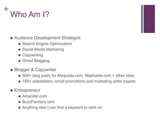 Amanda MacArthur is an audience development strategist specializing in SEO, social media marketing, and copywriting. She emphasizes the importance of personal branding and mastering keyword research to improve online visibility and effectiveness in marketing. Key steps in SEO include controlling one's online presence, understanding client needs, and incorporating effective writing to drive traffic and improve rankings.