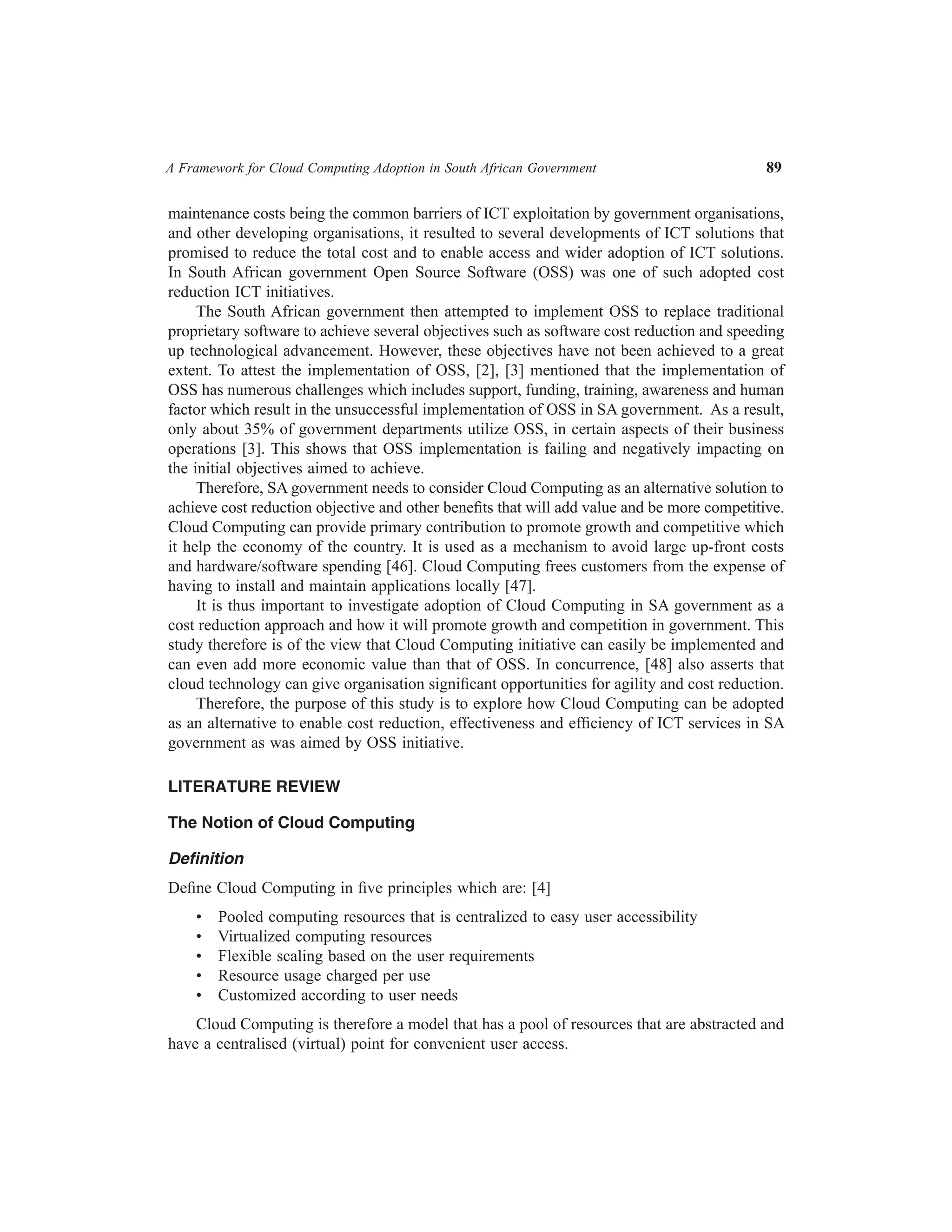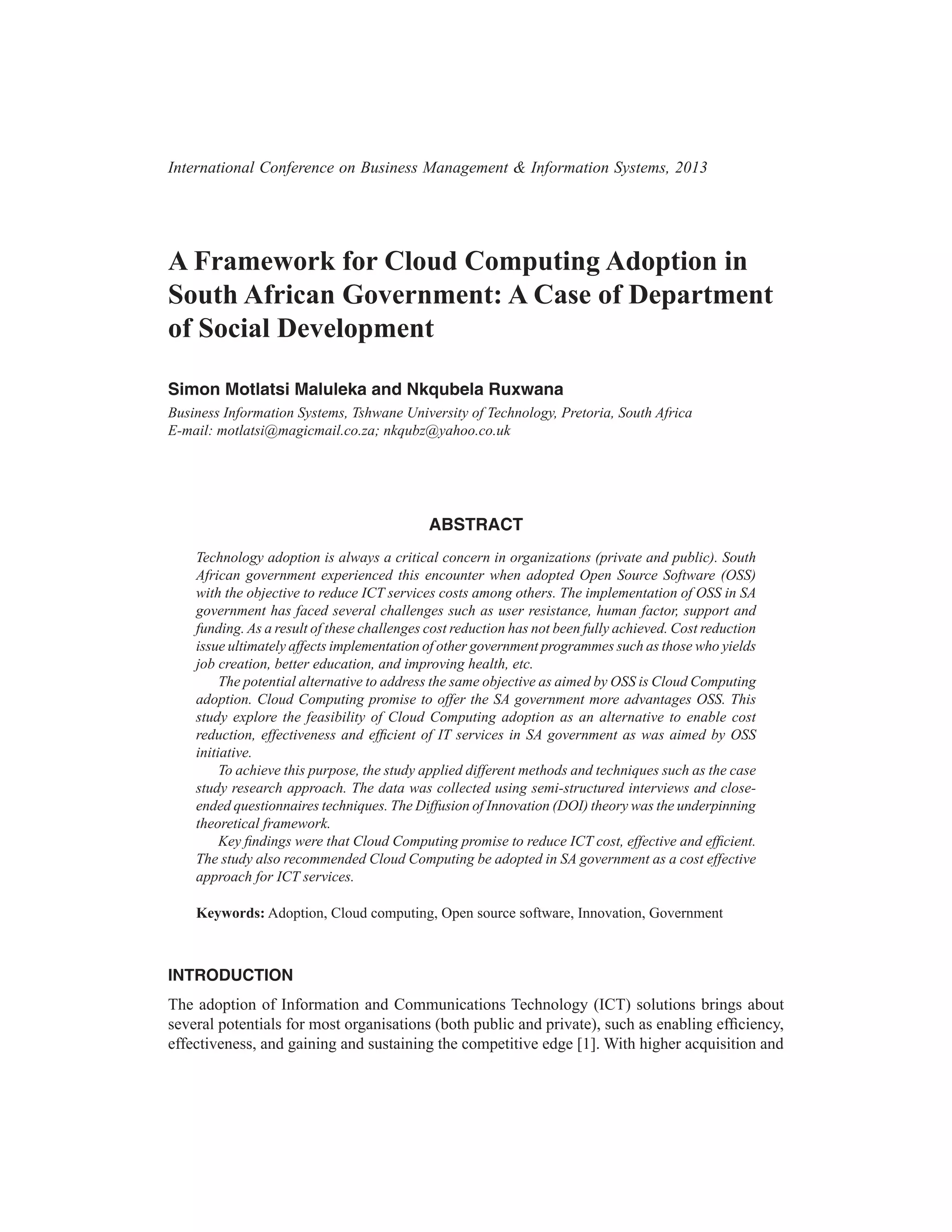 The document discusses a study exploring the adoption of cloud computing in the South African government as an alternative to open source software (OSS) to achieve cost reduction and improve ICT services. It highlights the challenges faced by the OSS initiative, including user resistance and funding issues, which have hindered its success. The findings suggest that cloud computing could provide significant benefits such as efficiency, cost savings, and enhanced service delivery in the public sector.