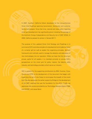 This document provides Southern California Edison's (SCE) updated smart grid strategy and roadmap. It discusses the need for a smarter grid to meet policy goals around climate change, energy independence, and infrastructure security. A smarter grid is needed to integrate more renewable energy, enable customer participation, and ensure continued reliability. SCE developed its first smart grid roadmap in 2007 and this updated roadmap summarizes SCE's activities and plans for developing and implementing a smarter grid through 2030 using a methodology of customer-focused engineering, open innovation, scenario planning, standards development, and technology evaluation.