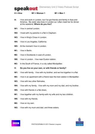 The document is a transcript of a podcast that discusses where various people live and what they like to do with friends and family. It includes responses from several women and men who live in various cities like London, Los Angeles, Berlin, and Montpellier. Some live alone, some with family, and some with roommates or flatmates. They see their friends and family with varying frequencies, from daily to once a month, and enjoy activities like going to meals, the cinema, parks, and unique activities like making music or road trips.