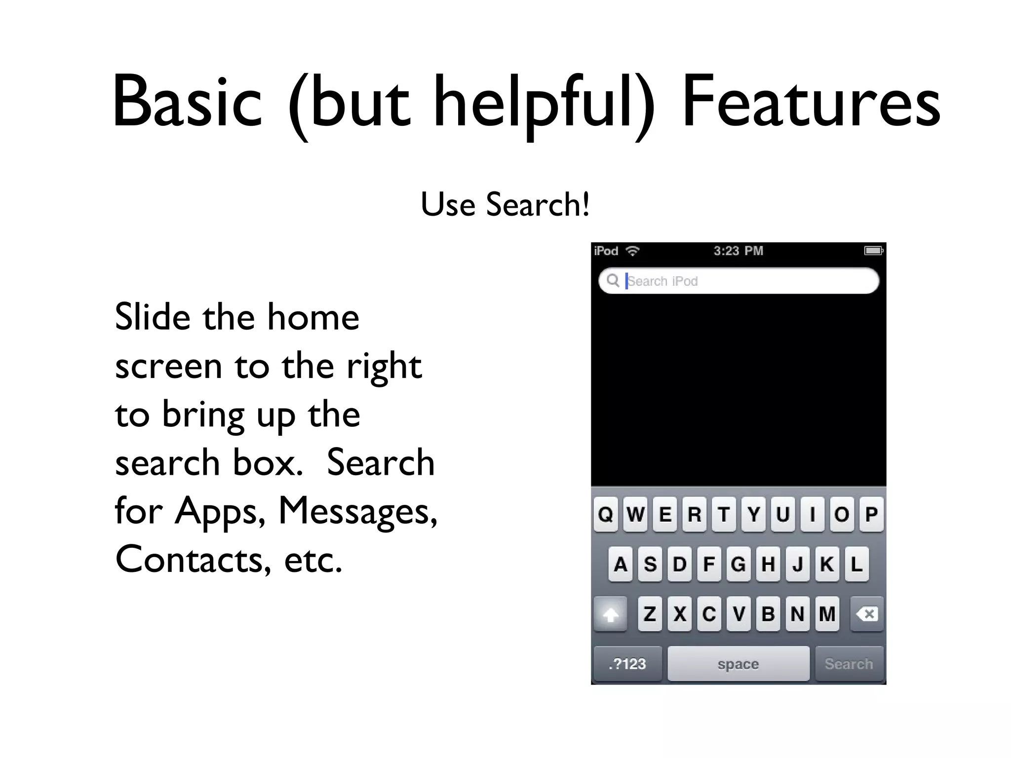 This document provides a summary of basic features and tips for using an iPod Touch or iPhone, including how to take screenshots, move apps, search, copy and paste text, and use passcodes. It also lists and briefly describes several app categories and specific apps for math, science, language arts, social studies, and fun including games, music, and sharing apps. Keyboard and Safari tips are also included for quick deleting, capping letters, and changing URL extensions.