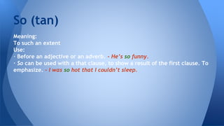 So is used to indicate extent or result, such as "I was so hot that I couldn't sleep." More is used to indicate additional amounts of uncountable or countable nouns. Too and very both indicate extremity, with too used for unmanageable levels and very for manageable levels, such as "It's too cold" versus "It's very cold." Enough indicates sufficiency and usually follows adjectives or precedes nouns it modifies. Examples are provided to illustrate the proper uses of these terms.