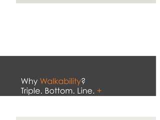 The document discusses how the State of Place method can be used to quantify walkability and its relationship to economic outcomes. It describes how the State of Place index measures various dimensions of the built environment and uses these measurements to predict returns on investment from improvements to increase walkability. The results can help prioritize interventions and maximize benefits while balancing costs.