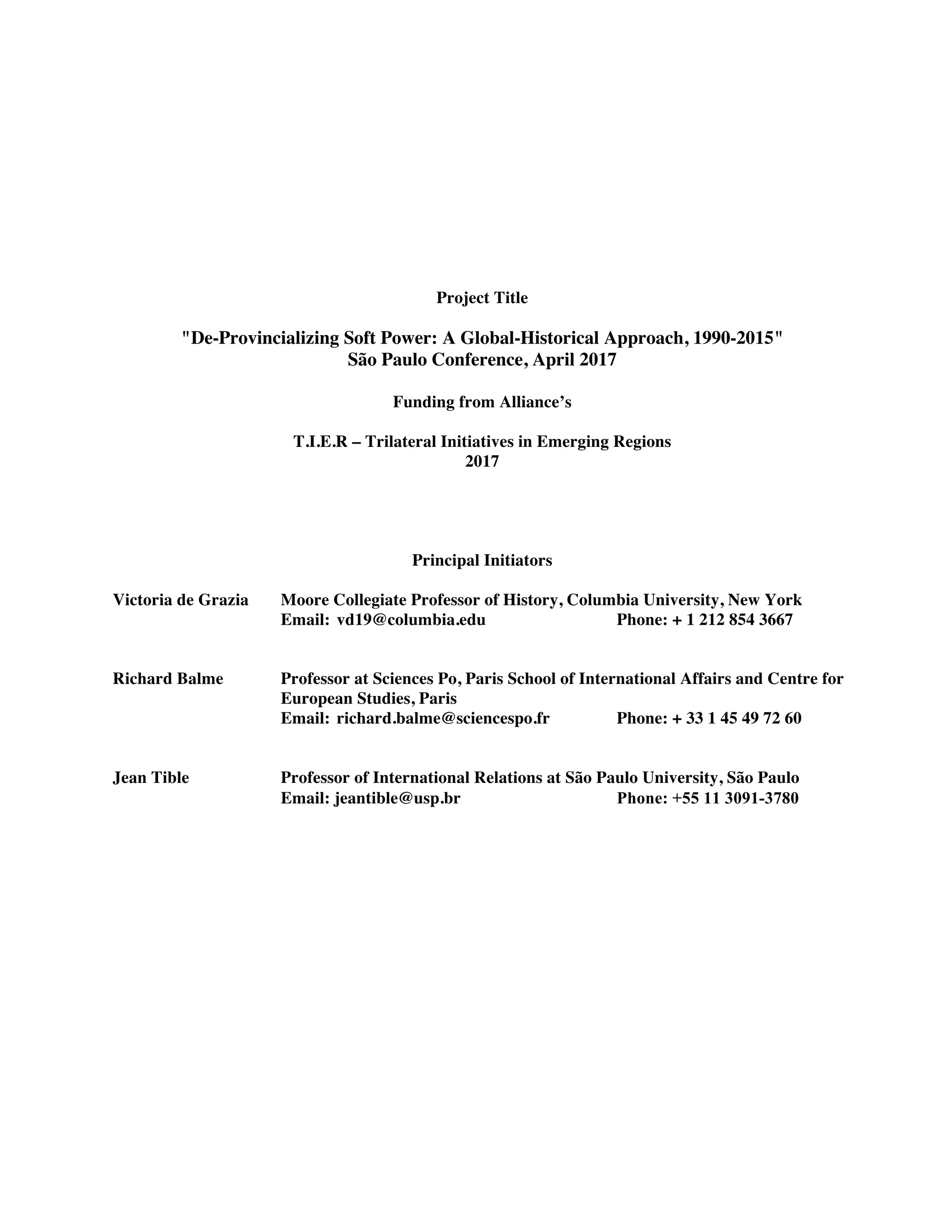 The document outlines a research project titled 'De-Provincializing Soft Power: A Global-Historical Approach, 1990-2015,' which involves a two-day conference in São Paulo in April 2017 to analyze Brazil's cultural power in foreign relations. Led by scholars from Columbia University, Sciences Po, and São Paulo University, it compares Brazil's experiences with those of the US, Europe, Turkey, and China while focusing on the evolution and implications of 'soft power' in global politics. The project emphasizes a multilateral approach to understanding cultural influence and seeks to contribute to scholarly dialogue and curriculum development regarding international relations and cultural studies.