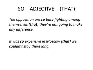 This document provides examples of using "so" and "such" constructions in sentences. For "so" sentences, it gives examples using adjectives and quantity words followed by "that" clauses. For "such" sentences, it demonstrates using adjectives and the phrase "a lot" followed by nouns and optional "that" clauses. The purpose is to illustrate how to properly structure sentences using "so" and "such" with different parts of speech.