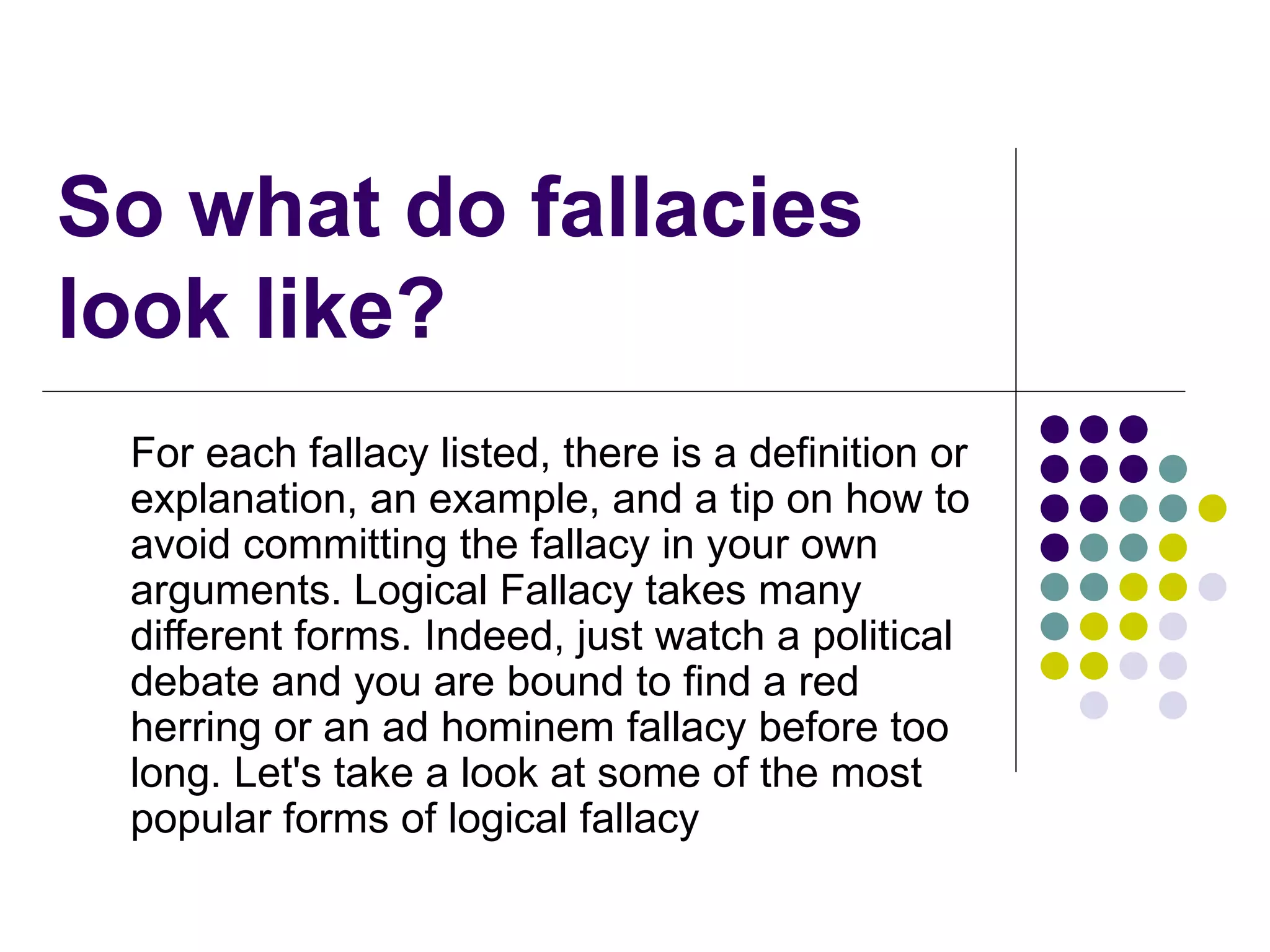- Ad hominem - Attacking the person making an argument rather than the argument itself