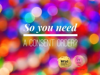 The document provides an overview of consent orders in family law, detailing what they are, their advantages and disadvantages, and the process for obtaining one. It covers the types of matters consent orders can address, such as financial and parenting issues, and offers tips for drafting and filing. Additionally, it discusses how to change consent orders and emphasizes the importance of legal advice.