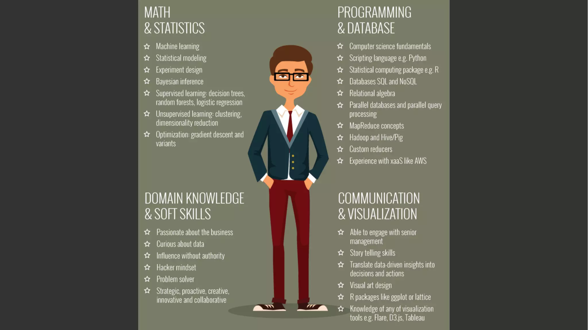 The document provides an overview of what it means to be a data scientist. It defines data scientists as those who gather, clean, explore, model, and interpret data, blending skills in hacking, statistics, and machine learning. Effective data scientists also have strong soft skills like domain knowledge, problem solving ability, and being able to communicate insights visually. The document contrasts the roles of data science and data engineering, noting that data engineering focuses more on data ingestion, integration, and preparation pipelines, while data science solves problems by analyzing patterns in data. It provides tips for getting started in data science, emphasizing learning domains of interest, business needs, mathematics, programming, and big data technologies.