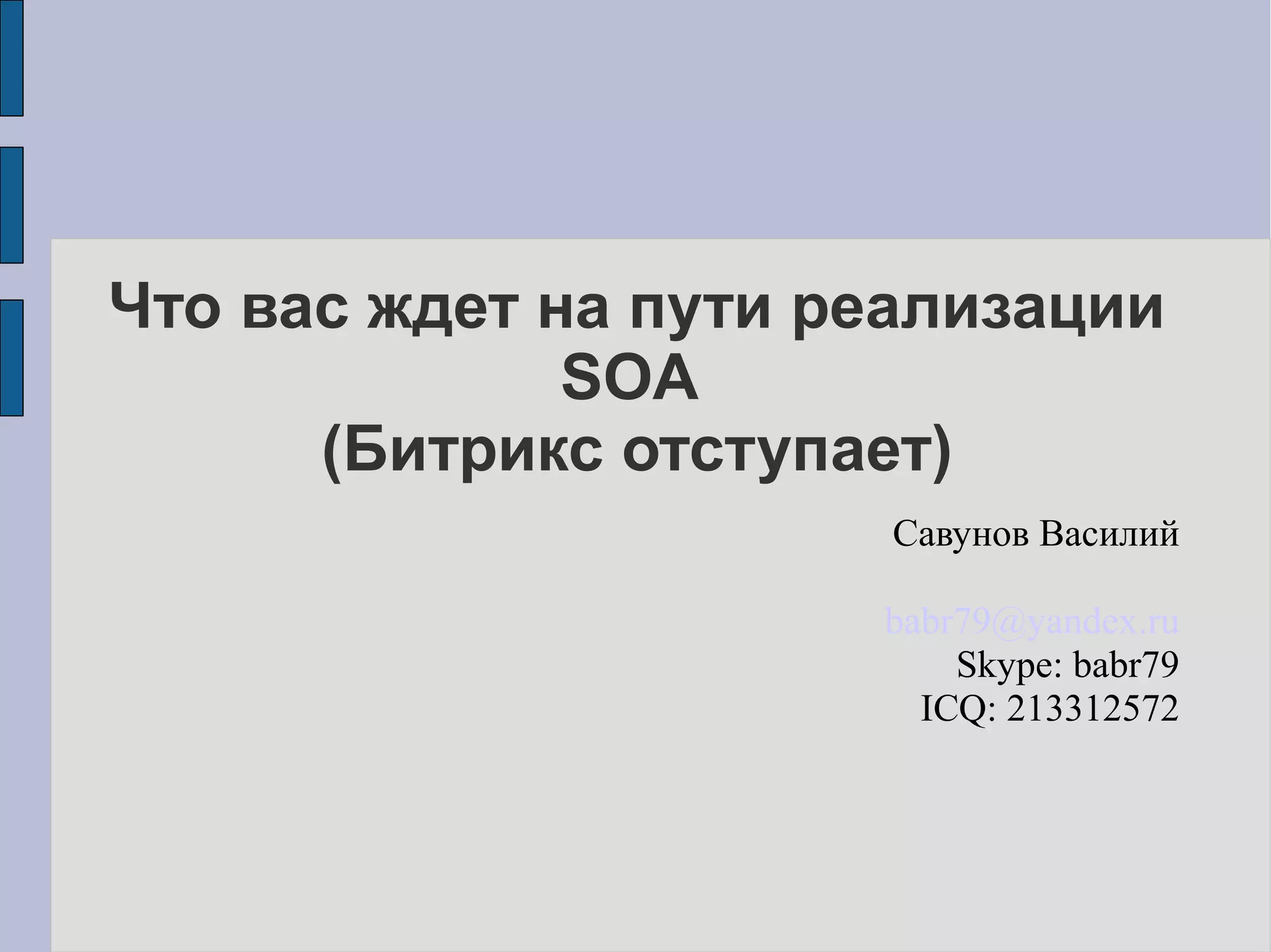 Доклад Савунова Василия обсуждает внедрение архитектуры SOA в проекте 'Битрикс' для banki.ru, акцентируя внимание на трудностях, связанных с масштабированием и поддержанием проектов. Среди представленных решений - переход на SOA, что обеспечивает большую гибкость и независимость сервисов, однако требует тщательного проектирования и увеличивает инфраструктурные затраты. В завершение доклада приведены рекомендации для успешной реализации SOA и достижения высокого уровня разработки без негативного воздействия на проект.
