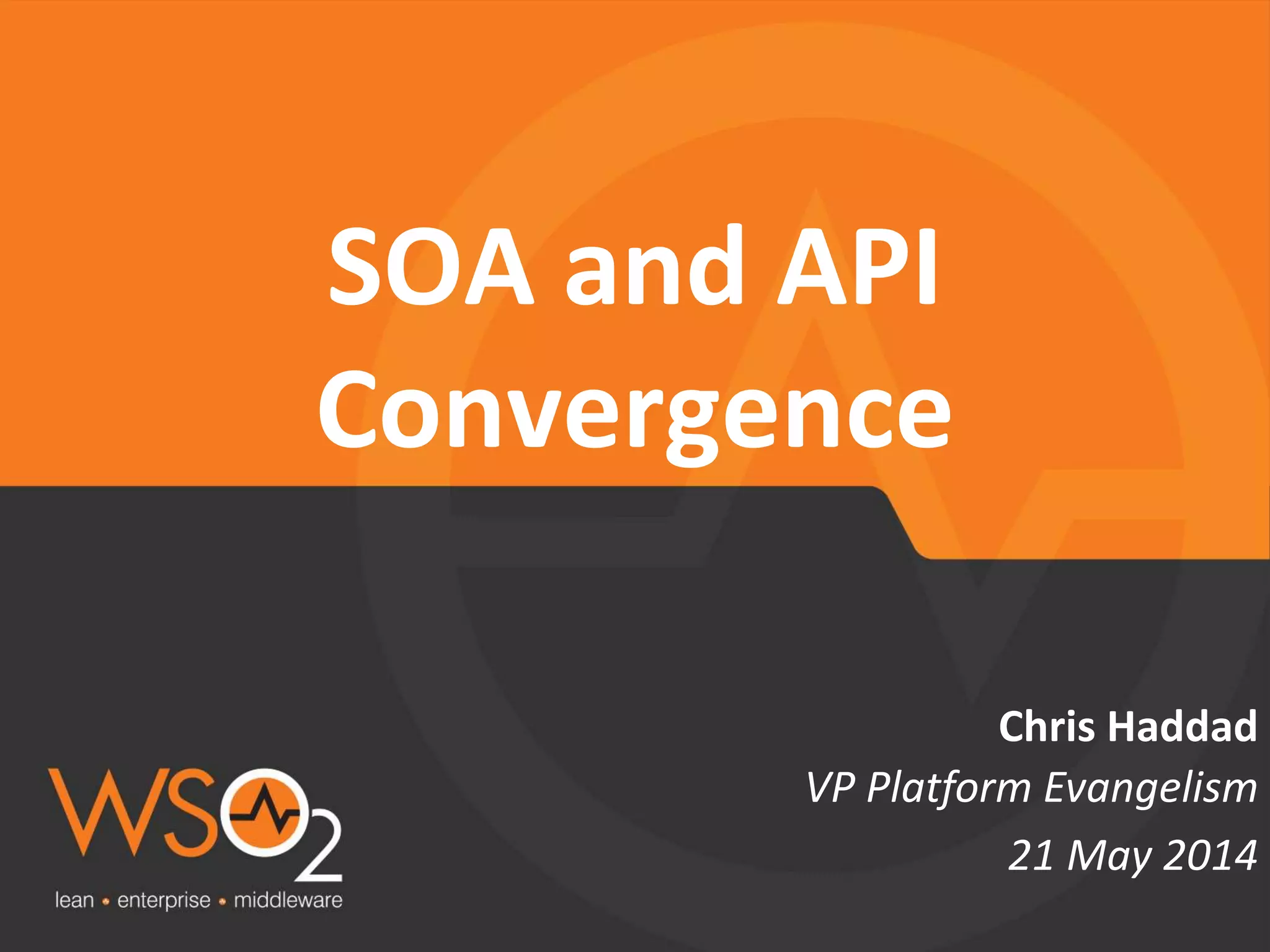 The document by Chris Haddad discusses the convergence of SOA (Service-Oriented Architecture) and APIs (Application Programming Interfaces), providing strategies for effective adoption and implementation. It highlights the importance of cross-functional collaboration, gradual implementation, and pragmatic design principles to enhance service reusability and governance. Additionally, it outlines approaches for API management and the distinction between services and APIs in their lifecycle and governance.