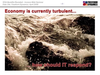 This document discusses how adopting a service-oriented architecture (SOA) approach can help organizations respond to economic pressures. While SOA is often touted for cost and efficiency benefits, these are not always realized. To be effective during downturns, SOA requires a balanced approach that streamlines application development and maintenance, enhances business visibility and responsiveness, and drives process automation and optimization, rather than just focusing on cost cutting. The document provides advice on taking a strategic yet tactical approach to SOA adoption by beginning with real project requirements, reviewing existing initiatives, managing expectations, and ensuring business impact is considered.
