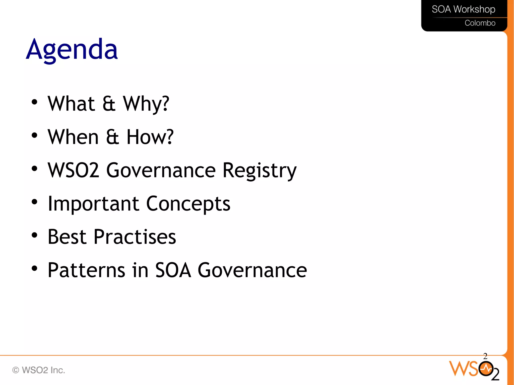 The document outlines the importance of SOA (Service-Oriented Architecture) governance, discussing its phases, key concepts, and best practices for implementation. It introduces the WSO2 Governance Registry, a lightweight open-source platform for managing SOA governance, and highlights essential features and deployment strategies. Additionally, it covers common governance patterns and provides resources for getting started with WSO2.