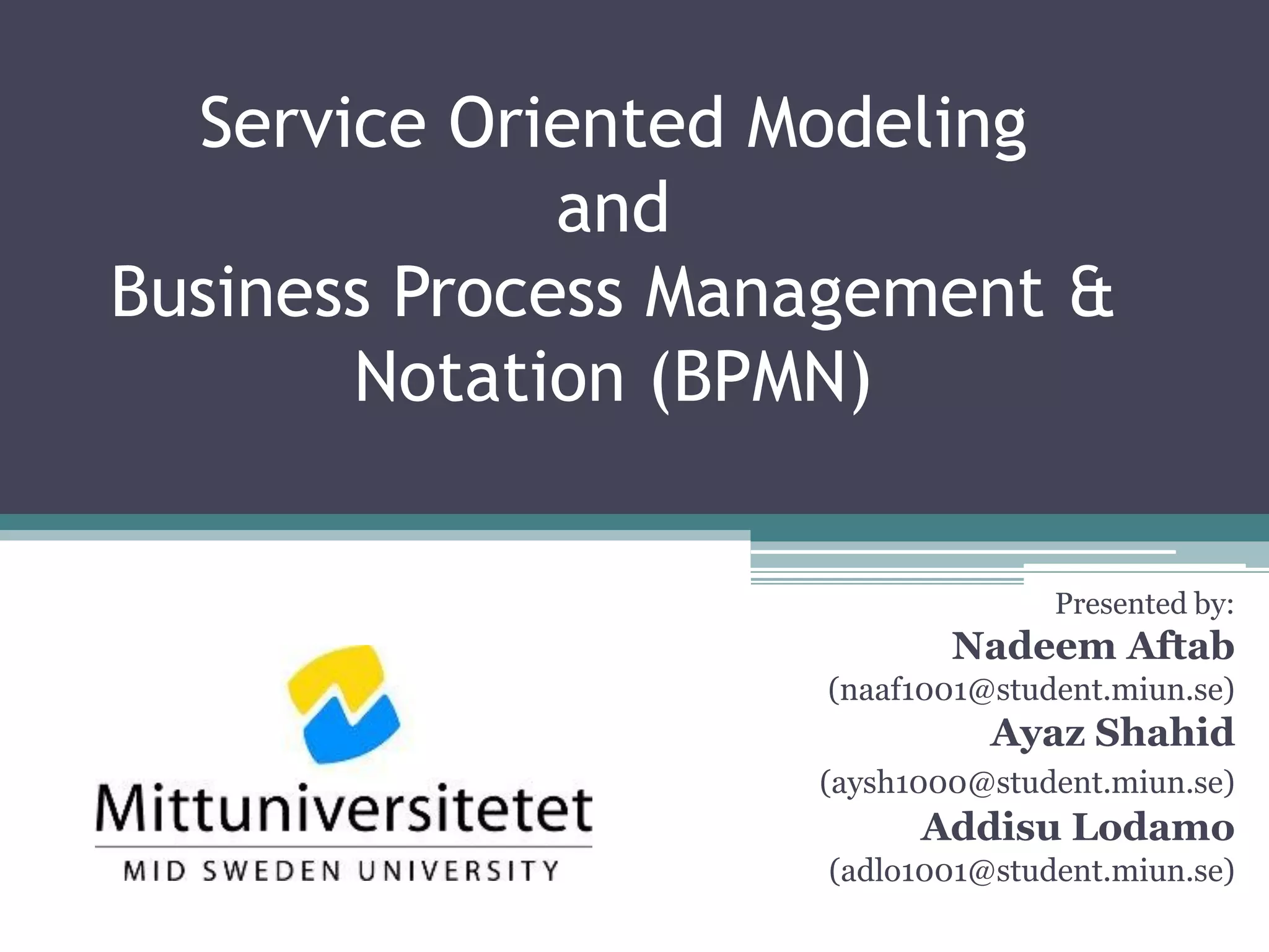 The document provides an overview of service oriented modeling and Business Process Modeling Notation (BPMN). It discusses key concepts like the service oriented architecture (SOA) life cycle, modeling approaches such as the Service Oriented Modeling Framework (SOMF) and BPMN. The presentation is delivered by three students and includes an introduction, definitions of terms, modeling techniques, and a question/answer session.