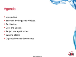 The document discusses the six domain model for SOA, which includes business strategy and process, architecture, building blocks, projects and applications, organization and governance, and cost and benefit. It provides details on each domain and how they are interrelated and important for a successful SOA implementation. Business strategy and process focuses on aligning IT with business goals through process optimization. Architecture discusses service-based and standard-based design. Cost and benefit outlines how benefits accumulate over time through reuse, standardization, and improved delivery capabilities.