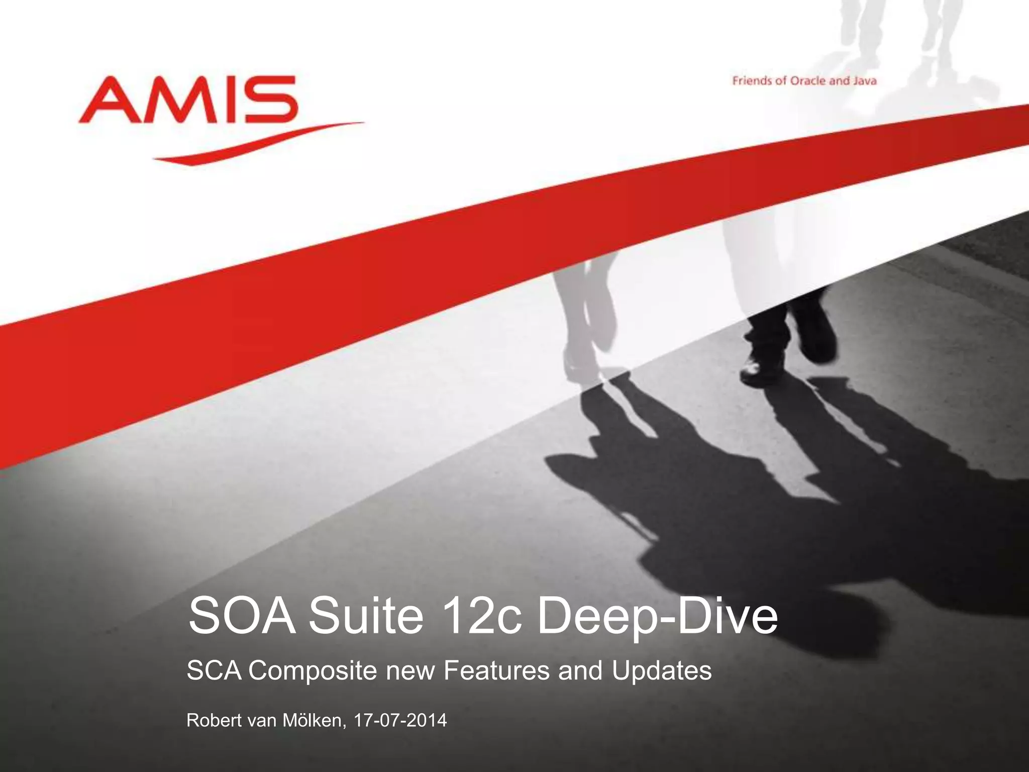 The document outlines significant updates and features of the SOA Suite 12c, focusing on changes in project structure, the introduction of reusable templates, and enhancements in BPEL sub-processes, mediators, and testing functionalities. Key improvements include better organization of components, the ability to share artifacts across applications, and tools for managing performance and fault policies. Additionally, new data encryption capabilities and interactive runtime sensor modifications are discussed, enhancing both security and operational flexibility.