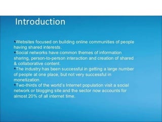 This document defines social networks and social networking. It provides examples of popular social networking sites like Facebook, Twitter, LinkedIn, and discusses their uses for communication, sharing media, and professional networking. The document also outlines safety tips for youth using social networks, including keeping personal information private and only posting information they are comfortable sharing publicly.