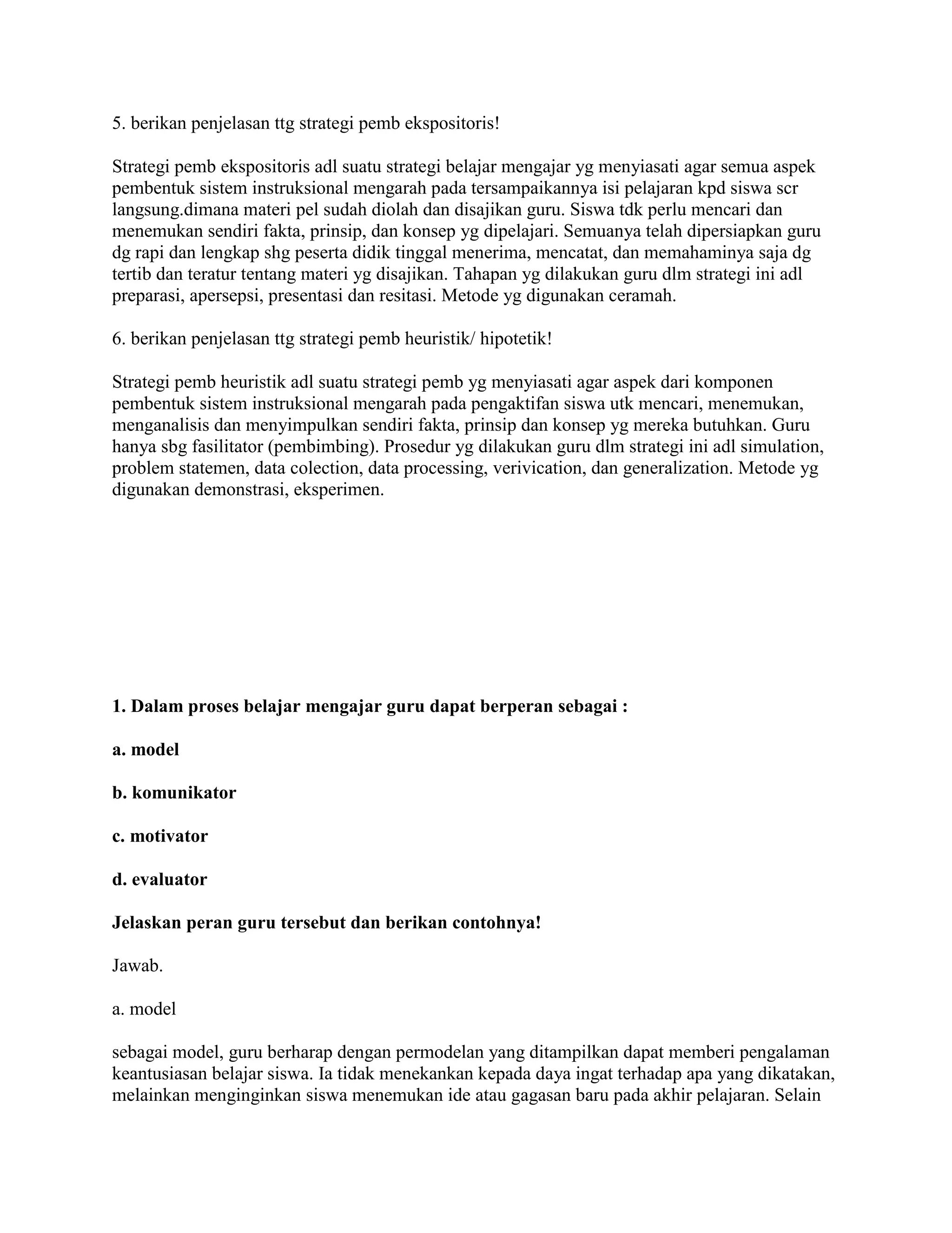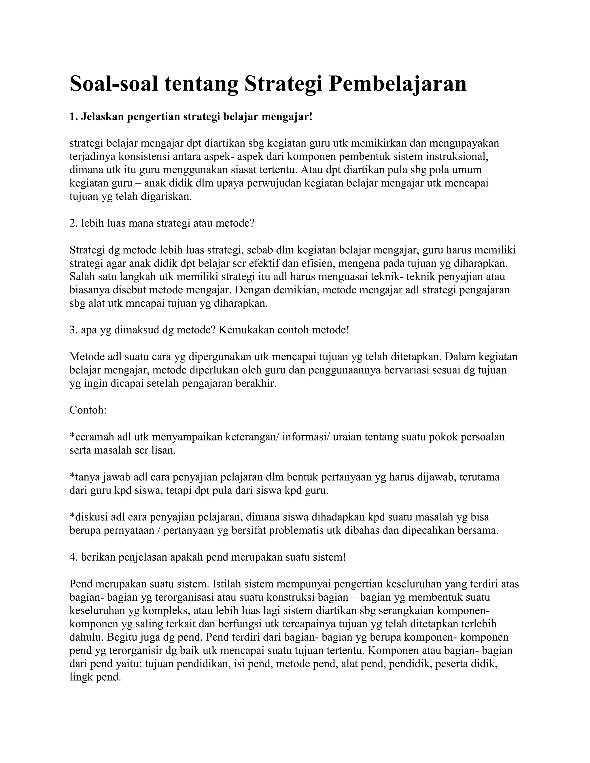 Dokumen ini membahas tentang strategi pembelajaran yang meliputi pengertian, perbedaan antara strategi dan metode, serta peran guru dalam pembelajaran. Strategi pembelajaran dibedakan menjadi ekspositoris dan heuristik, dengan penjelasan masing-masing metode yang digunakan. Selain itu, pentingnya pemahaman guru terhadap strategi ini serta upaya yang perlu dilakukan dalam implementasinya untuk mencapai tujuan pendidikan yang efektif juga diuraikan.