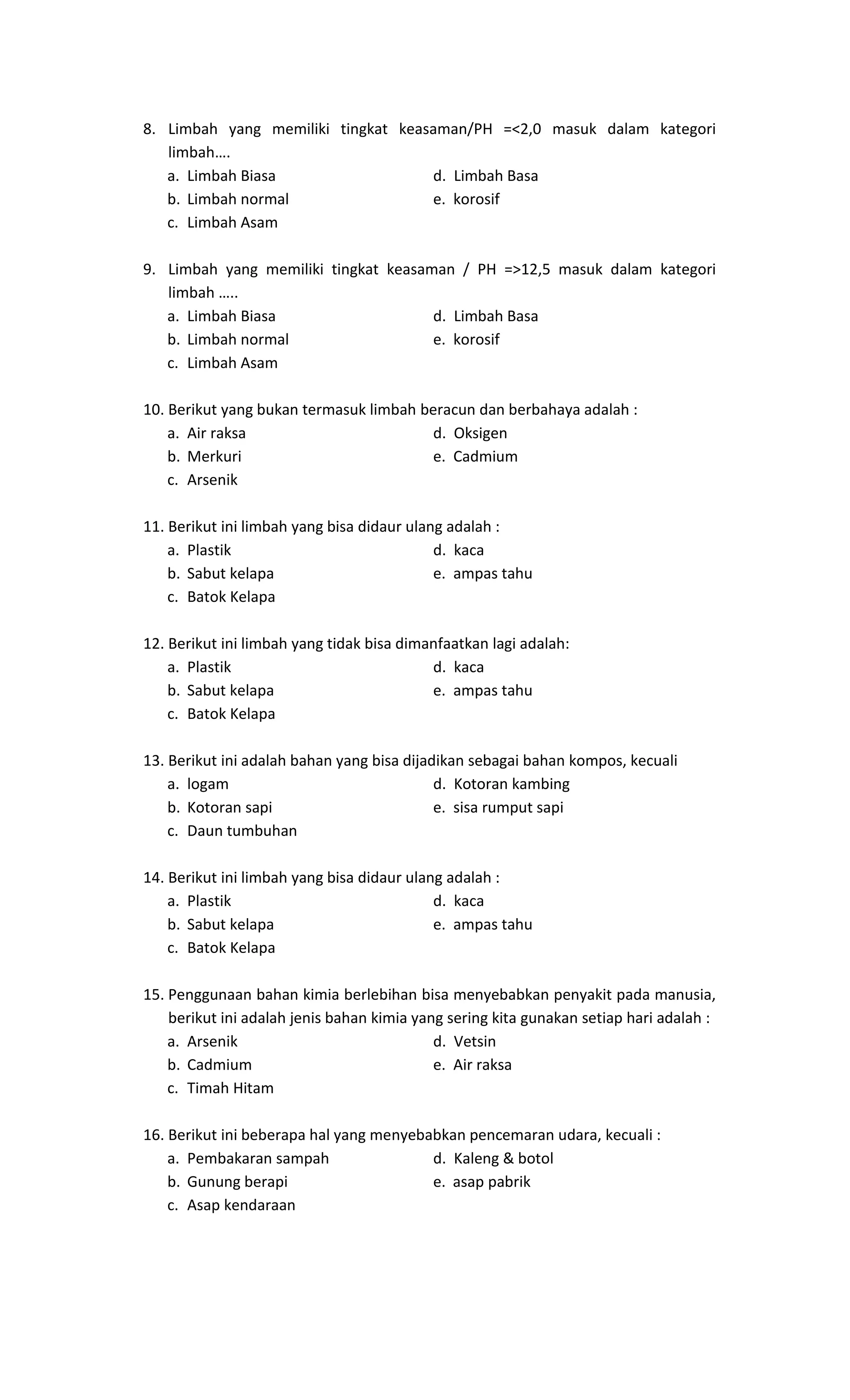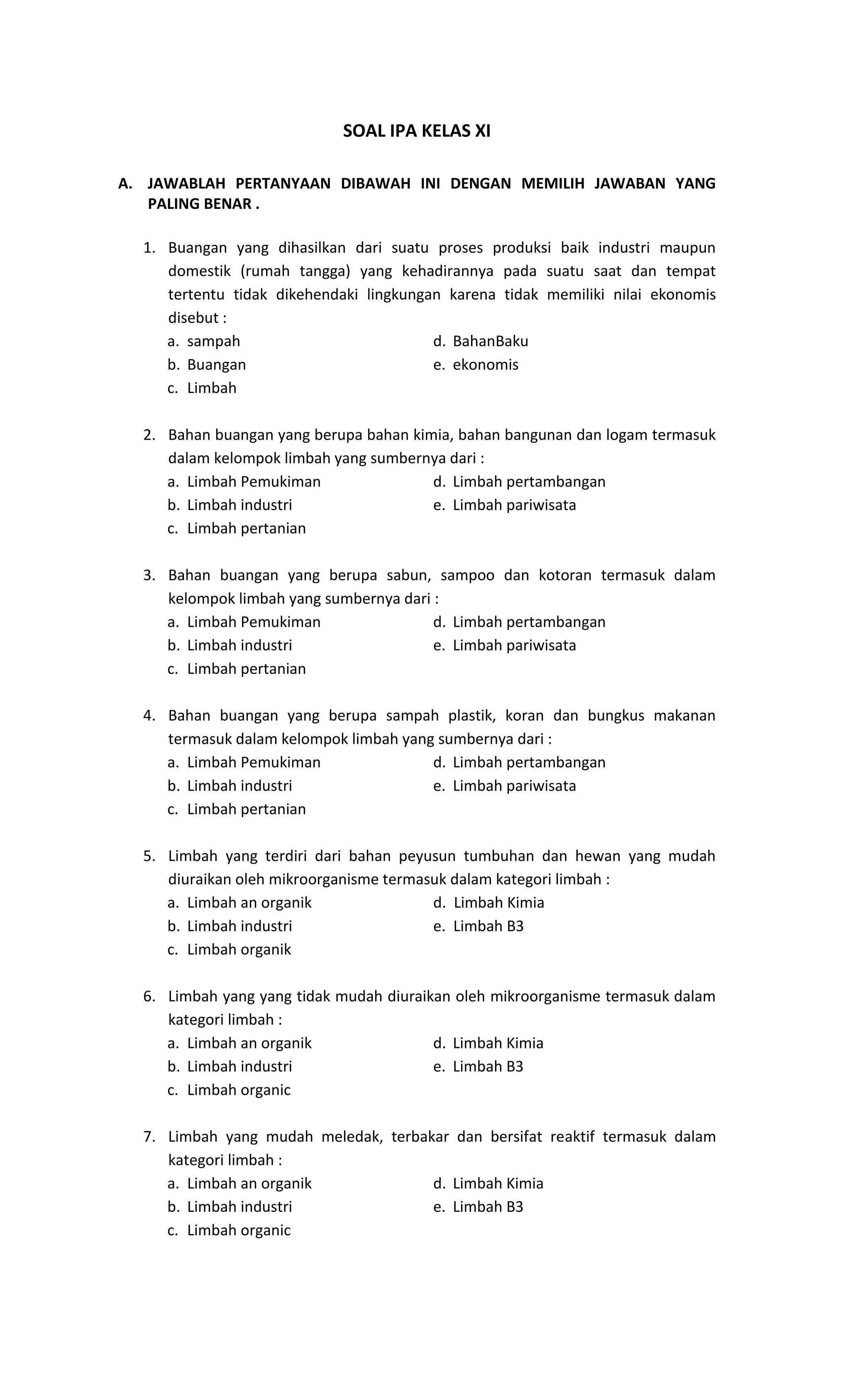 Dokumen ini berisi soal-soal IPA untuk siswa kelas XI dan X yang mencakup berbagai aspek limbah, pengetahuan ilmiah, dan metode ilmiah. Pertanyaan dalam dokumen menuntut siswa untuk memilih jawaban yang tepat dan memberikan penjelasan singkat. Selain itu, dokumen juga mencakup pertanyaan esai tentang definisi limbah, pola pertumbuhan, serta faktor-faktor yang mempengaruhi pertumbuhan tanaman.