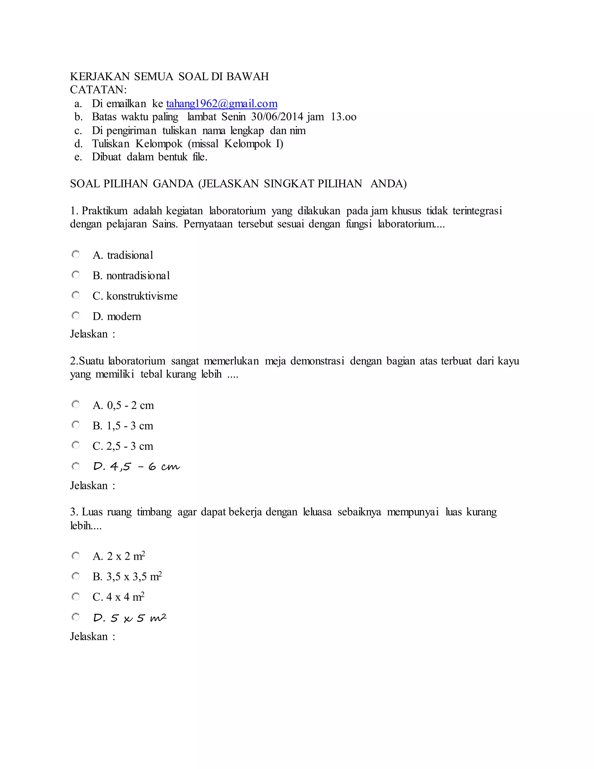 Dokumen tersebut berisi instruksi pengerjaan soal-soal tentang laboratorium IPA yang harus dikirim ke email tertentu paling lambat tanggal 30 Juni 2014.