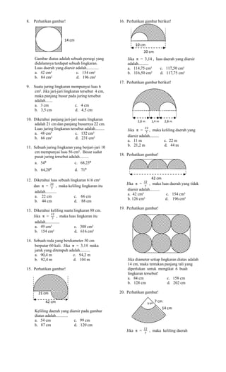 Dokumen tersebut berisi soal uji kompetensi mata pelajaran matematika kelas VIII tentang materi lingkaran yang terdiri dari 25 soal pilihan ganda. Soal-soal tersebut meliputi konsep-konsep seperti juring lingkaran, busur lingkaran, keliling dan luas lingkaran, sudut pusat, dan garis singgung persekutuan. Dokumen ini bertujuan untuk mengukur pemahaman siswa terhadap materi lingkaran.