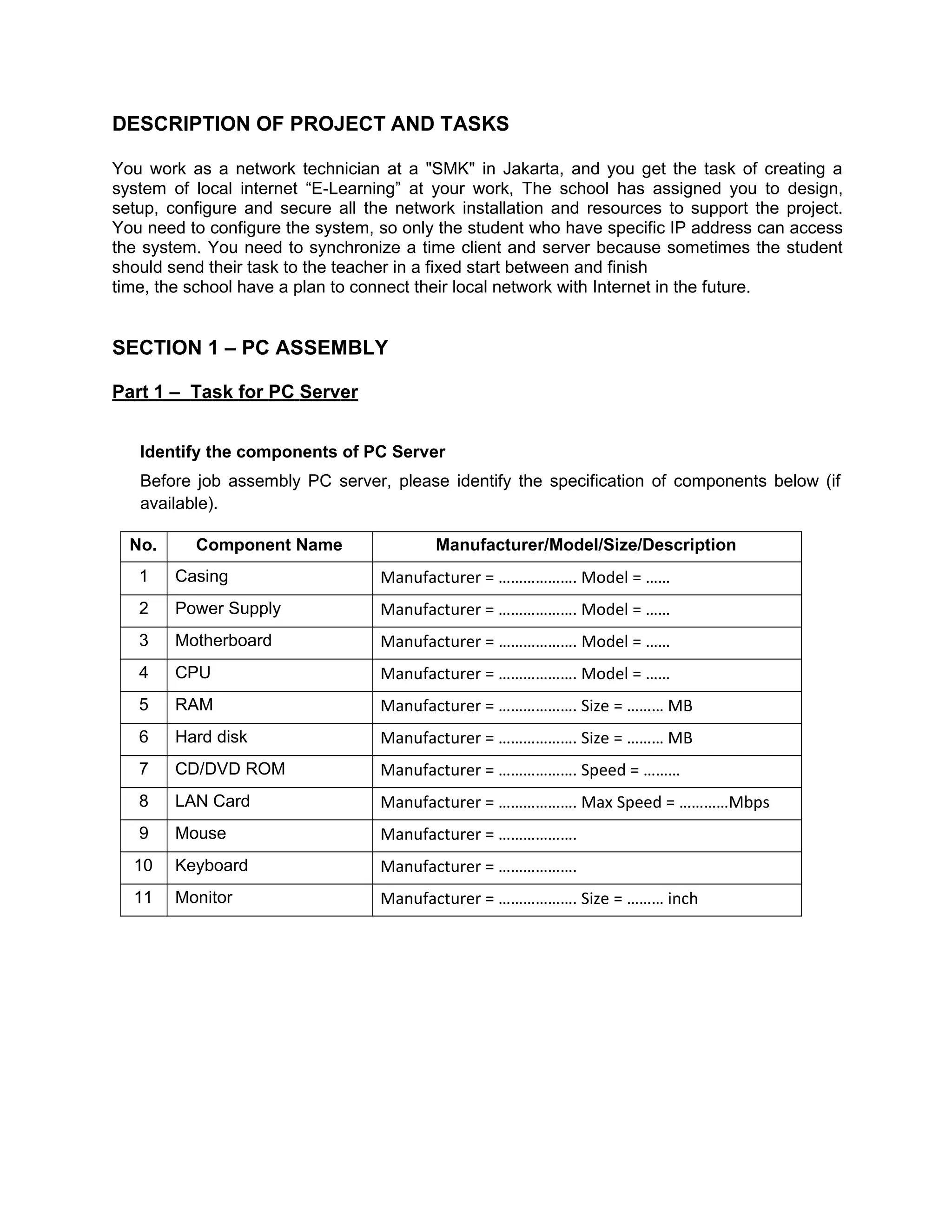 The document describes tasks for setting up a local internet e-learning network for a vocational school in Jakarta. The tasks include assembling PC servers and clients, installing operating systems, configuring networking components like routers, DHCP, DNS, firewalls, mail servers, and troubleshooting connectivity issues. The network is to support an e-learning project allowing only specific student IP addresses to access course content within fixed time windows.